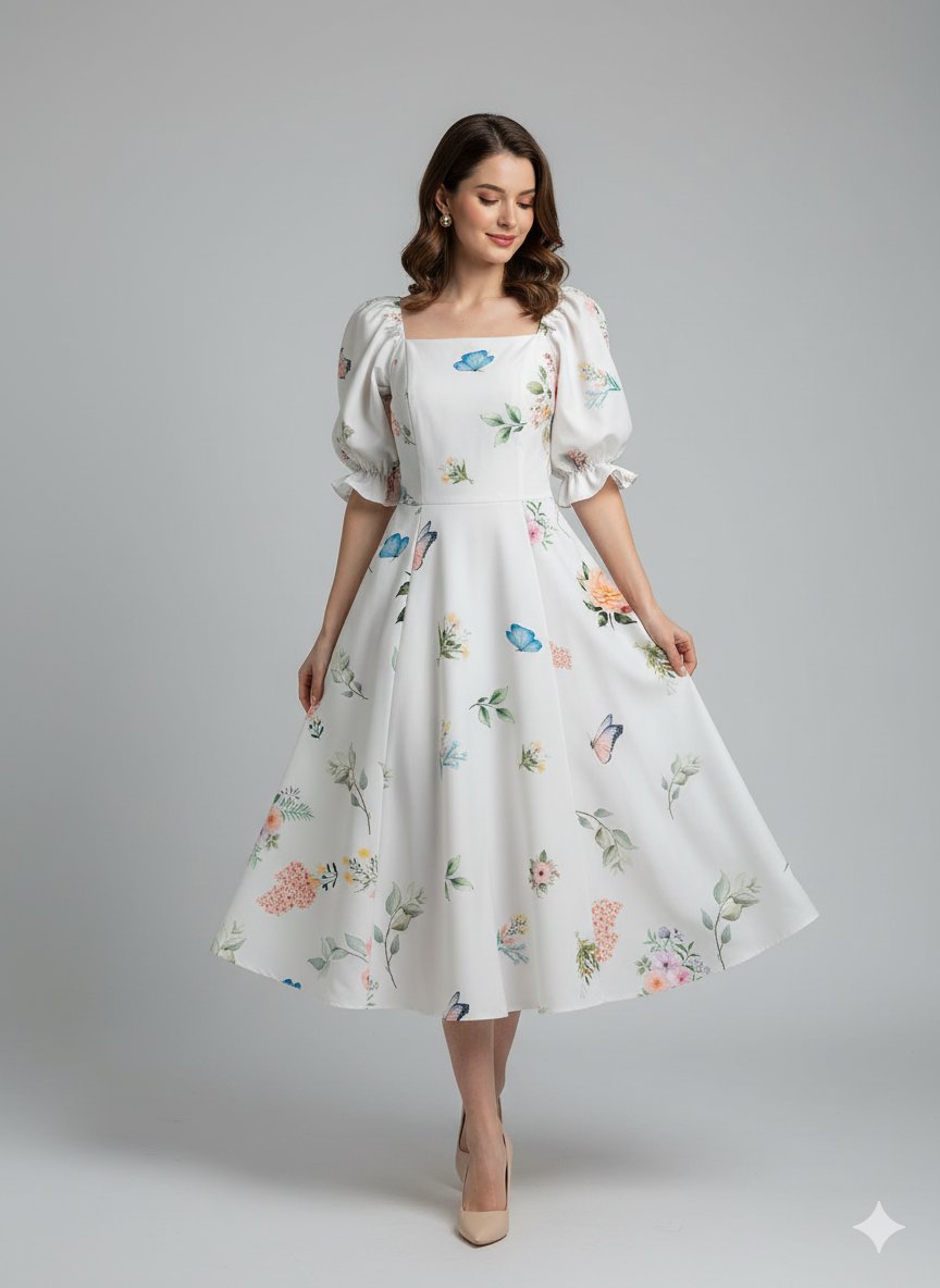 O vestido Heloisa, geralmente combina a elegância de um comprimento midi com a fluidez e o movimento da saia godê. A fenda adiciona um toque de sofisticação. Esse tipo de vestido pode ser ideal para diversas ocasiões, desde eventos mais formais até saídas casuais, possui bolsos embutidos nas laterais, lastex nas costas e mangas bufantes.