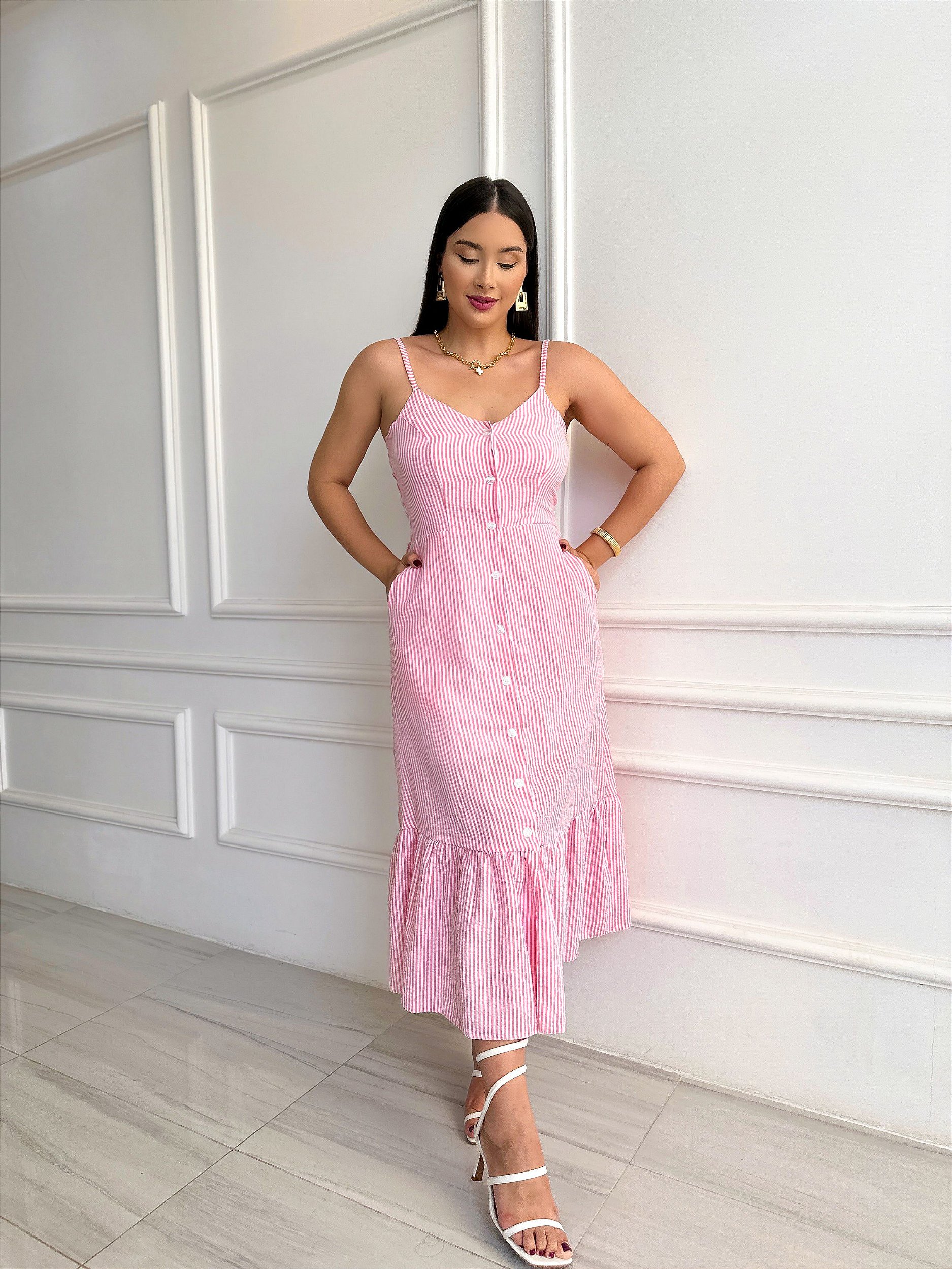 O Vestido Júlia conta com uma saia no formato reta com babado ,botões fake e lastex nas costas. Comprimento midi, e com alça. Ele é apropriado para diversas ocasiões, principalmente às mais formais. Disponível no tamanho único que veste do 36 ao 44, com forro e tecido com relevo.