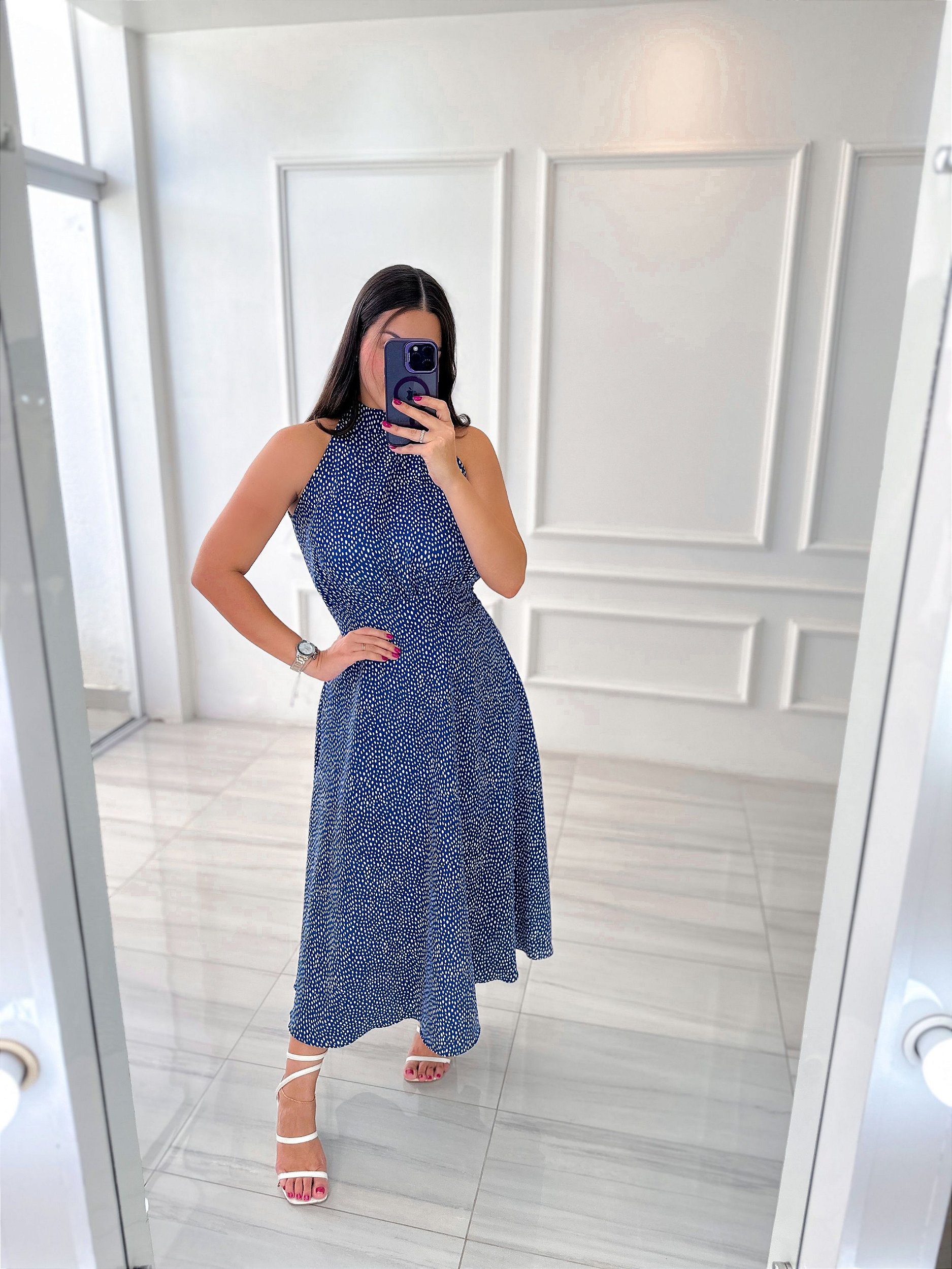 O vestido Pérola conta com uma saia no formato godê, lastex na cintura. Comprimento midi, sem manga, gola alta e amarração no pescoço. Ele é apropriado para diversas ocasiões, principalmente às mais formais. Disponível no tamanho único que veste do 36 ao 44 e com forro.