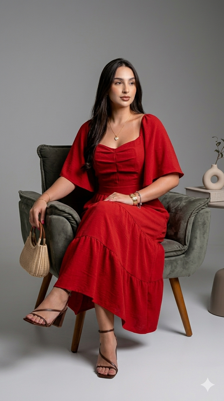 O Vestido Noele é a escolha perfeita para quem busca um look feminino, leve e elegante. Com saia no estilo três marias ele traz um caimento fluido e delicado que valoriza a silhueta com movimento e sofisticação.